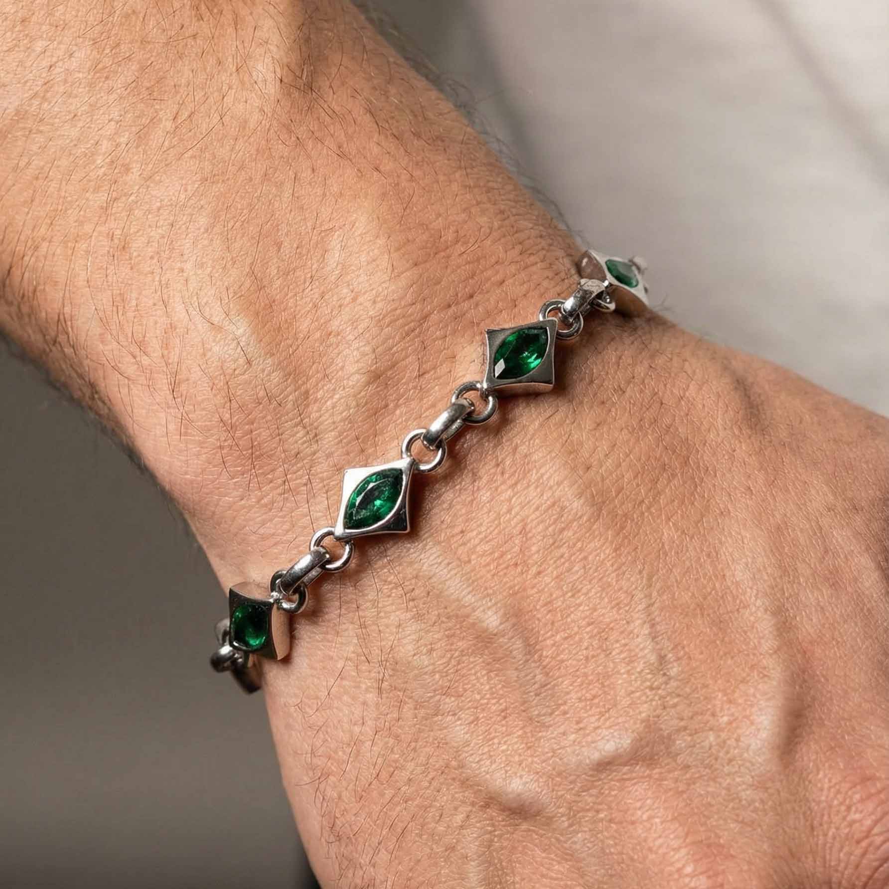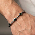 The Lyra bracelet combines futuristic precision with sophisticated color. Each diamond-shaped stainless steel element features a cut zirconia in deep emerald green.